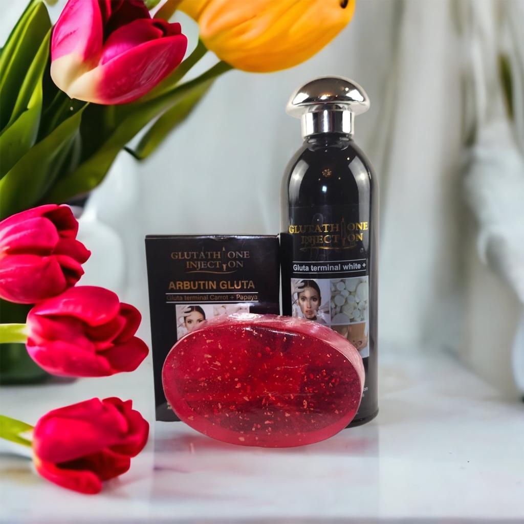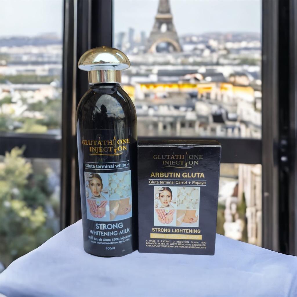 The set includes a 400ml bottle of Gluta Whitening Milk Lotion and a 150g bar of Gluta Whitening Soap.