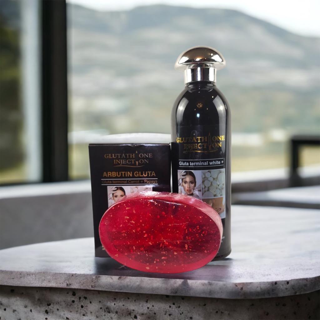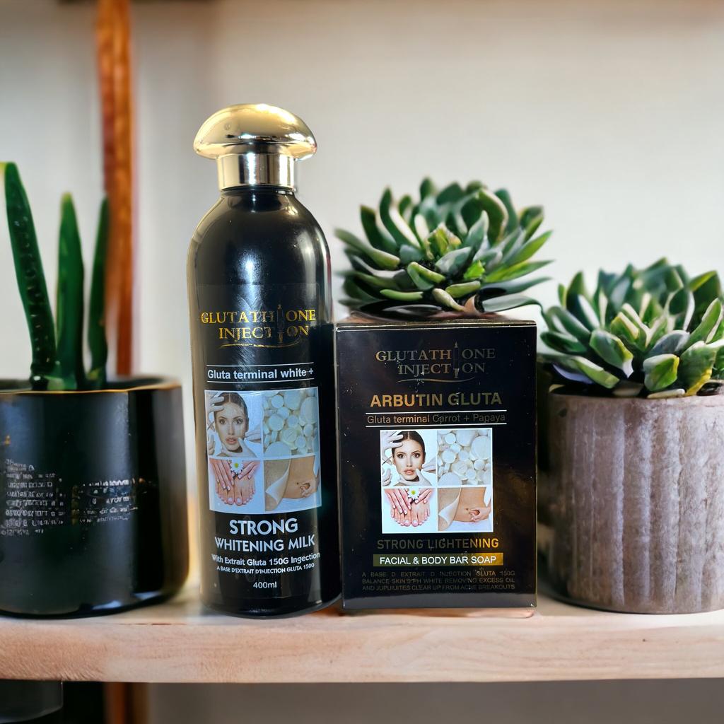 The Gluthaione Arbutin Hyperpigmentation Care Set offers a unique combination of two powerful lightening agents: Gluthatione and Arbutin. These two ingredients work synergistically to reduce the appearance of dark spots, blemishes and facial with body discoloration while providing long-term anti-aging protection. The scientifically-proven formula helps promote a lighter and more even skin tone, while also protecting the skin from environmental damage and making your skin look youngerOur Gluta Whitening Milk Lotion and Soap Set is the perfect solution for achieving a brighter and more even skin tone.
